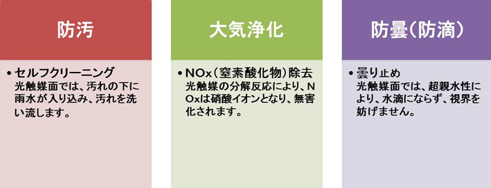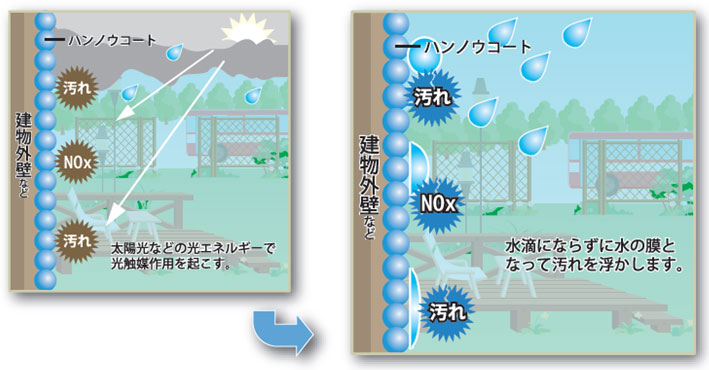 光触媒コーティングされた外装に、窒素酸化物(NOx)などが接触すると、酸化分解作用により無害化され、雨水などで流されます。光化学スモッグの原因となる大気汚染物質を分解無害化すると同時に、防汚効果を発揮します。