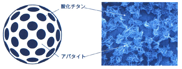 光触媒は、有機物を分解するため、定着させる機材そのものを分解してしまう欠点がありました。屋外のトタンに手で触ると「白い粉」が付きますが、これがチョーキングと言ってトタンの塗料が酸化分解された結果です。そこで、(独)産業技術総合研究所は、鉄型酸化チタンにアパタイト(カルシウムを被覆させる事に成功し、コーティング面に直接酸化チタンが触れない事で、定着面の劣化を防ぐ事が出来るようになりました。