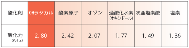 OHラジカルは、消毒、殺菌などに使われる塩素、次亜塩素酸などよりはるかに強い力で、環境浄化を行います。