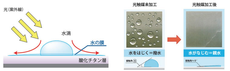 光触媒を建物の外壁やガラスにコーティングした場合、酸化チタンは、水との相性が良いため、壁面と汚れの間に水を入り込ませ、汚れを浮き上がらせます。雨天時に、汚れを洗い流す効果があります。(セルフクリーニング効果)